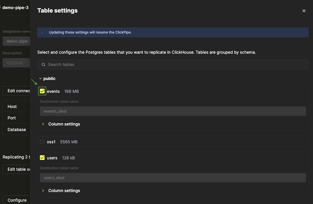 ClickPipe에서 특정 테이블 제거하기